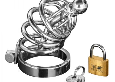 Take male chastity to the next level with the Asylum Locking Chastity Cage from Master Series which features multiple enclosure rings surrounding the shaft and a removable cum-thru urethral penis plug. The Master Series Asylum Locking Chastity Cage comes in two sizes, small/medium which has 4 enclosure rings along the shaft and a medium/large with 6 enclosure rings. The chastity cage is made of stainless steel which is non-porous, hygienic, easy to sterilize, temperature resistant, and impact resistant.